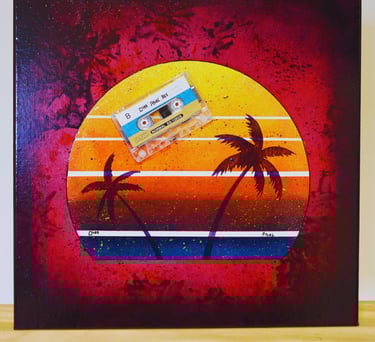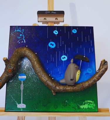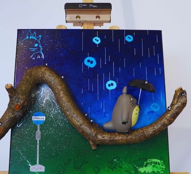 Aujourd’hui, je crée des œuvres où se mêlent peinture, cartes Pokémon ou Dragon Ball, figurines, manettes rétro, objets cultes. J’aime donner une deuxième vie à ces symboles de notre enfance et les transformer en pièces uniques à accrocher fièrement chez soi.