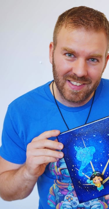 Mon art est né d’un besoin d’évasion : après des années dans l’horlogerie et la joaillerie, un monde où tout doit être parfait au millimètre près, j’ai ressenti l’envie de peindre librement. Très vite, mes toiles ont trouvé leur voie : elles sont devenues un terrain de jeu où l’abstraction rencontre la culture geek.