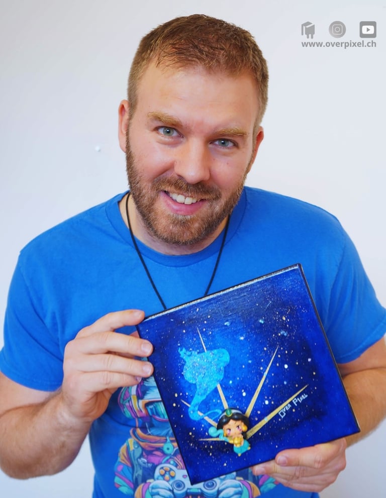 Je m’appelle Over Pixel, artiste suisse basé à Carouge, passionné de pop culture, de jeux vidéo, de cartes TCG, de figurines et de musique.