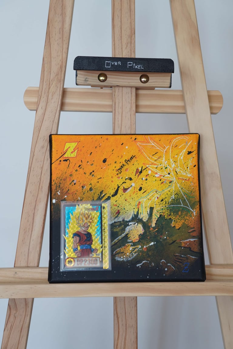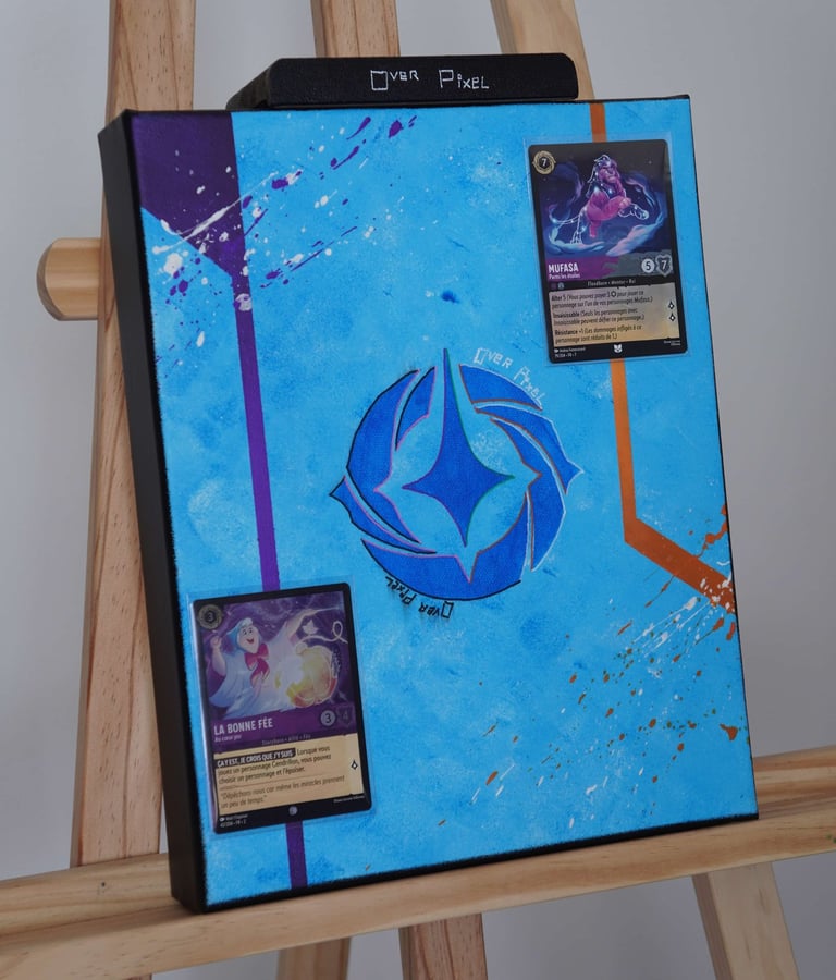 Chaque création est une pièce unique, peinte à la main, qui intègre des sleeves transparents directement dans la toile.